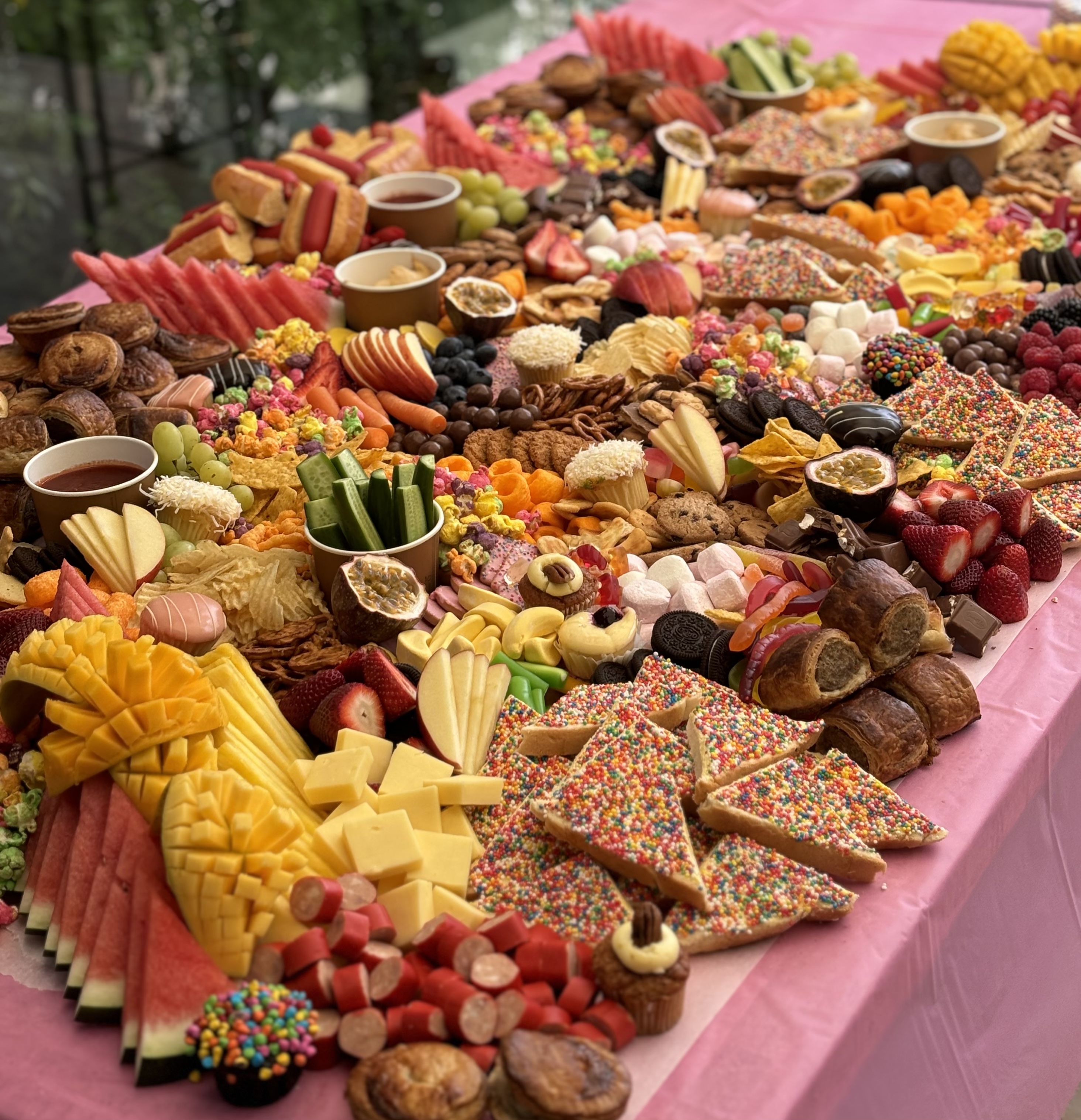 1 m long by 1 m wide Charcuterie and cold meat antipasto graze filled with berries and other seasonal produce. This Graze is set up on the premises and requires 1 to 2 hours prior to event. It includes bread and crackers. This Graze is suitable for 25 to 35 people. Price is excluding travel